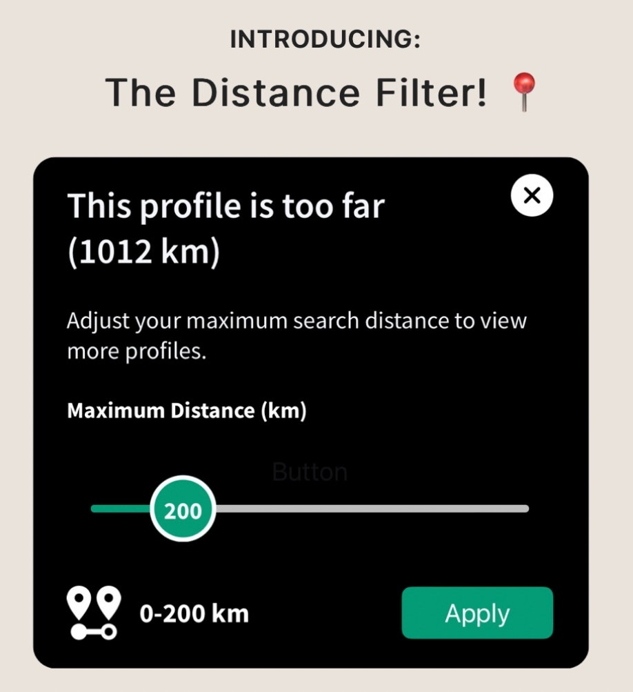Say hello to the Distance Filter – our #1 asked-for feature! It's your ticket to finding connections within your desired radius, whether you're looking for local lovers or up for a little long-distance charm.